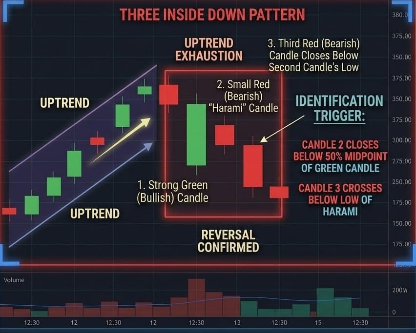 The "Stop Placement" Secret: One of the best features of the Three Inside Down is its clear "Risk-to-Reward" setup. Always place your stop-loss just above the high of the first (large green) candle. If the price climbs back above that level, the bearish thesis is invalidated. By waiting for the third candle to close before entering, you avoid the "Harami Trap" where price simply consolidates before continuing the original uptrend.