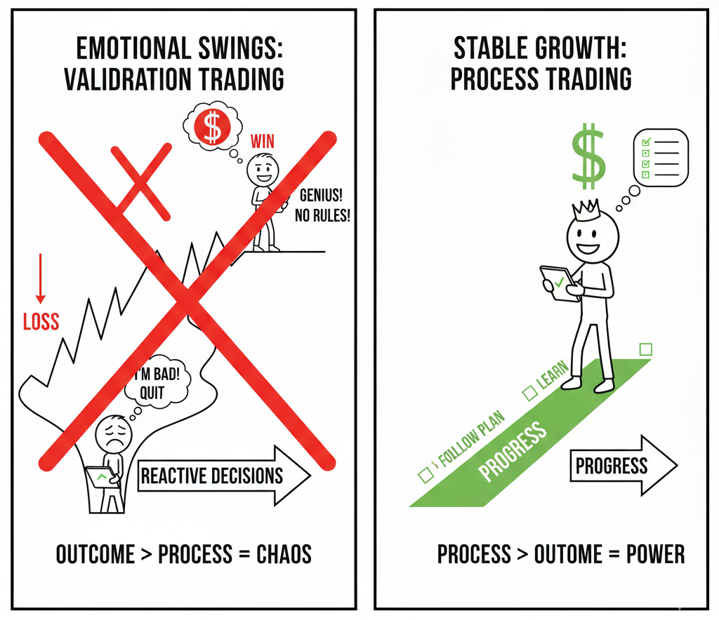 This mindset creates emotional swings. After a loss, confidence drops. After a win, discipline fades. Decisions become reactive instead of structured. The focus shifts from process to validation.