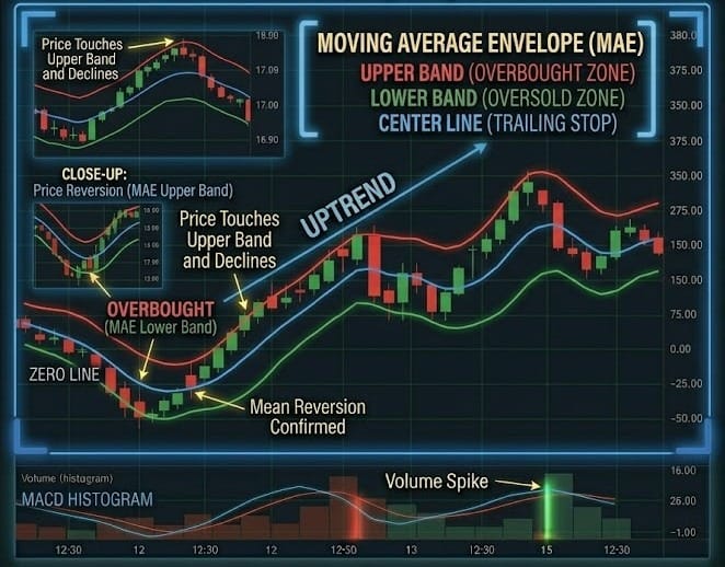 - THEN: A Breakout is confirmed. Since the envelope acts as a "fair value" container, a close outside the container suggests the market has found a new valuation and a trend is starting.