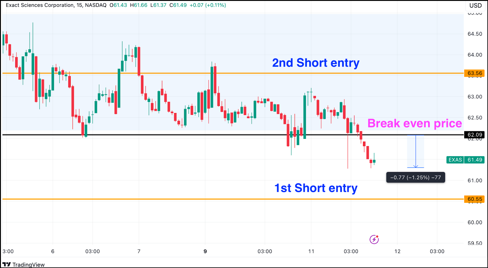 The price retraced, so I added a second SHORT position on Dec 6 at $63.56, bringing my break-even (BE) price to $62.09.