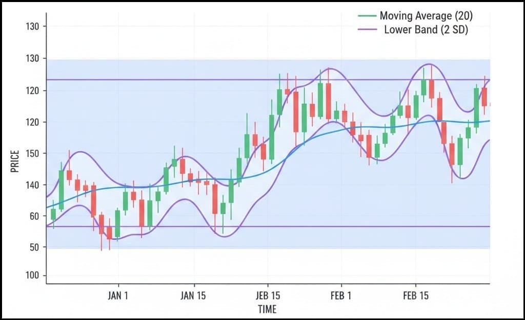 - Buy: When price touches the Lower Band and a reversal confirmation (like a bullish candlestick) is observed. The Middle Band or Upper Band may be used as a profit target.