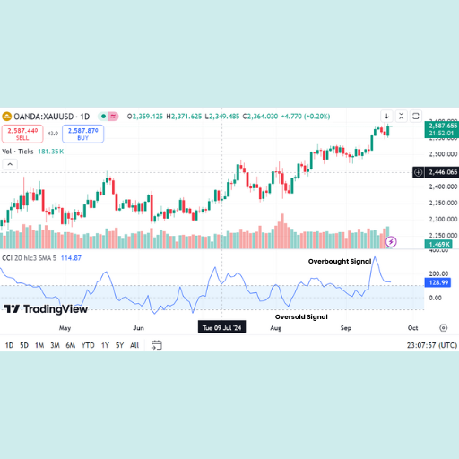 - Overbought: When the CCI moves above +100, it suggests the price is rising quickly and may be considered overbought