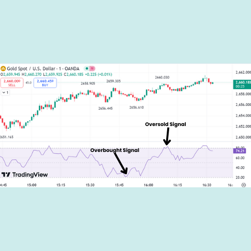 - Overbought (Above 80): A reading above 80 indicates that buying pressure is reaching extreme levels and the asset may be due for a downward correction.