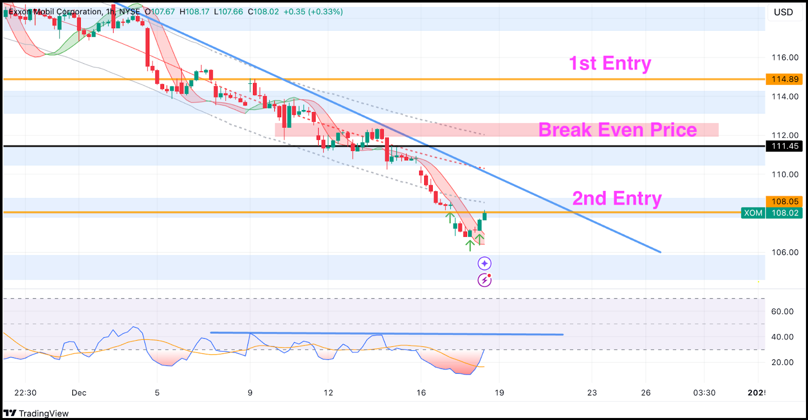Following an RSI crossover signal, I decided to take a second position at $108.02, which brings our average break-even price to $111.45.