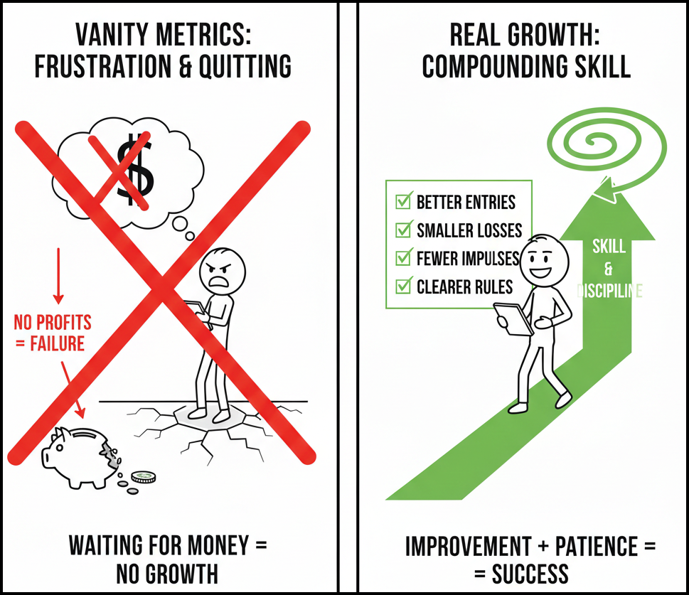 Most traders quit because they’re waiting for money to prove they’re improving. When profits don’t show up fast, they assume nothing is working.