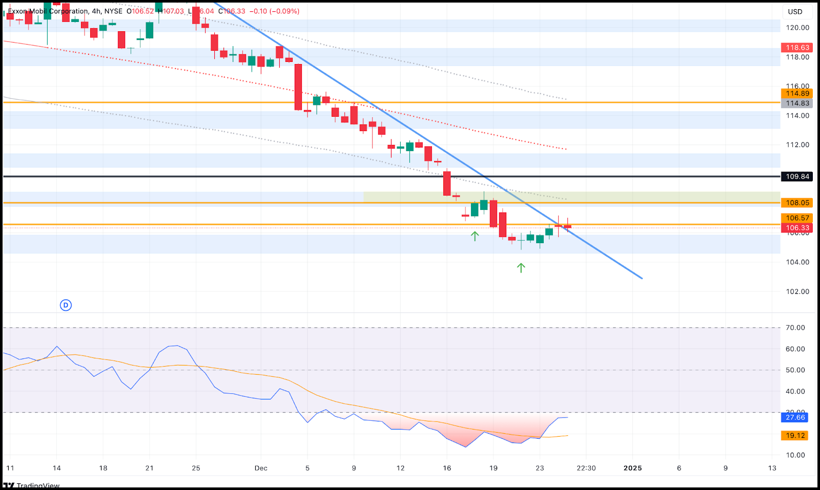 Regarding Exxon Mobile (XOM), the situation is developing favorably, and I'm taking the opportunity to add a final position at $106.57, which will adjust our break-even price to $109.84.