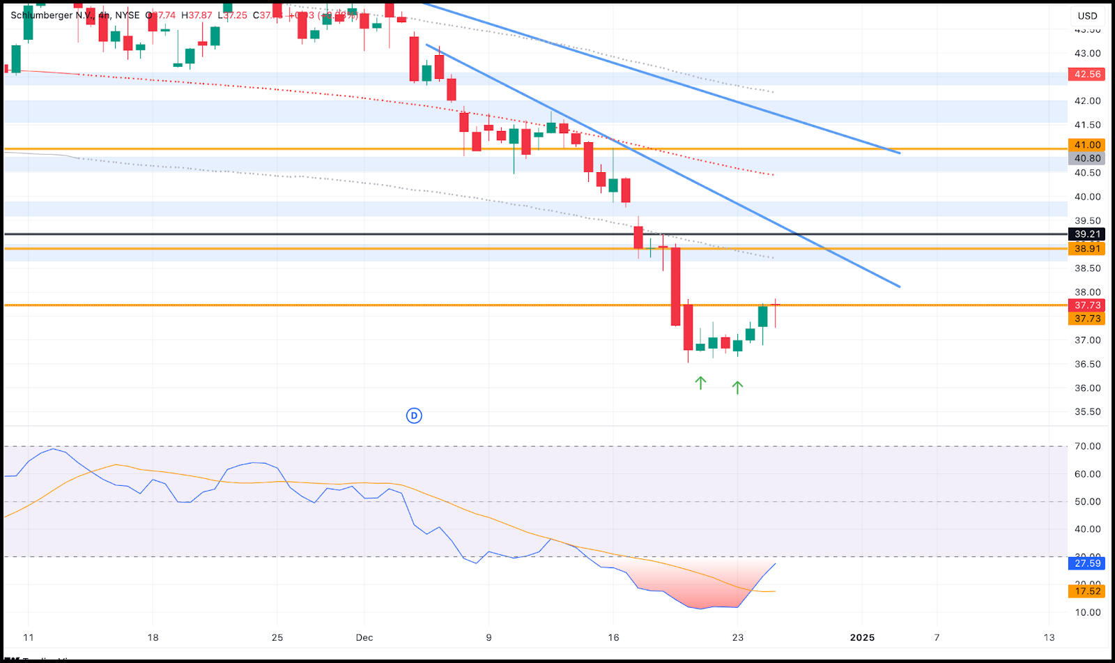 Schlumberger (SLB) is also showing signs of improvement, leading me to add a third and final position at $37.73, bringing our new break-even price to $39.21.