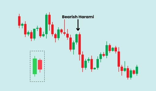 The Bearish Harami is a two-candle reversal pattern that signals a sudden "stall" in bullish momentum. It is the opposite of the Bullish Harami, appearing at the top of an uptrend.