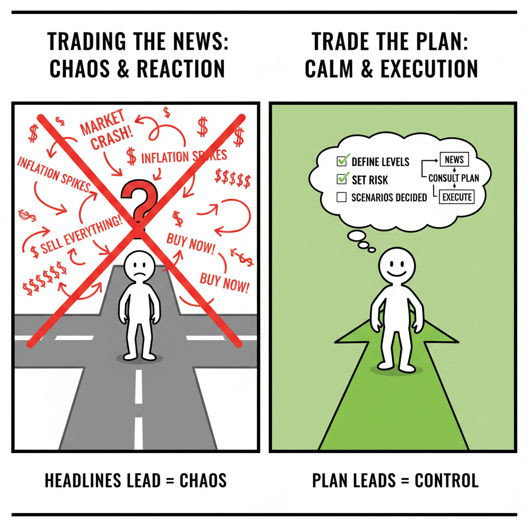 Strong traders decide before the noise. They define levels, risk, and scenarios in advance. When news hits, they already know what they will do. The plan leads. Headlines follow.