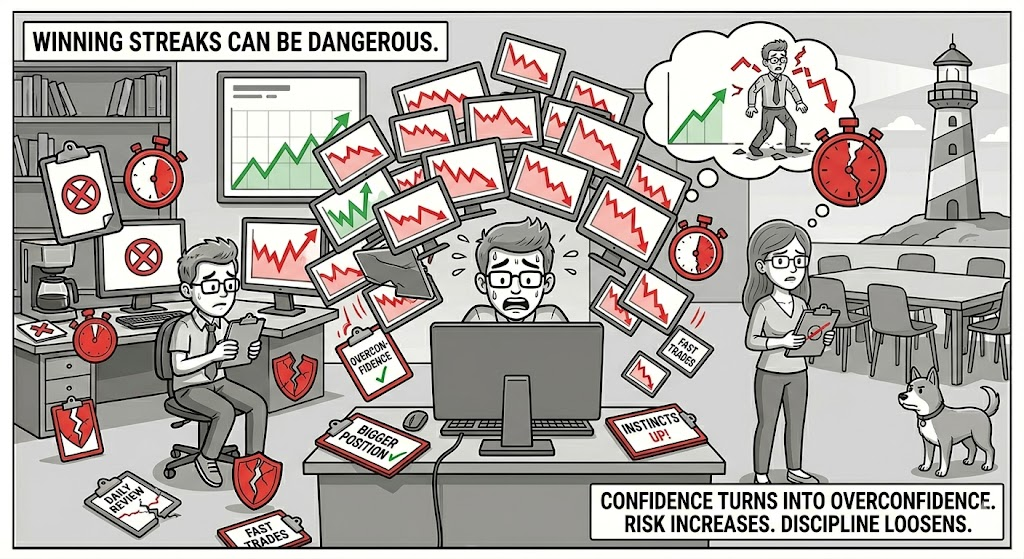 Confidence turns into overconfidence. Risk quietly increases. Discipline loosens. When the inevitable losing trade comes, it hits harder because more is on the line.