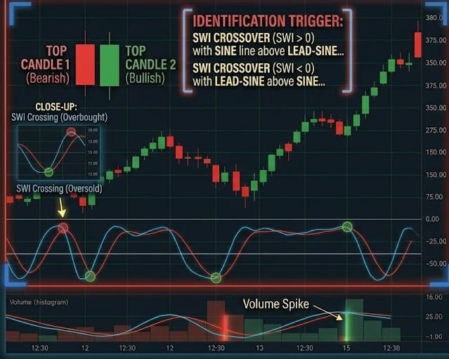Unlike standard oscillators, it uses two lines—the Sine (blue) and the Lead-Sine (red)—that cross each other like a DNA strand.