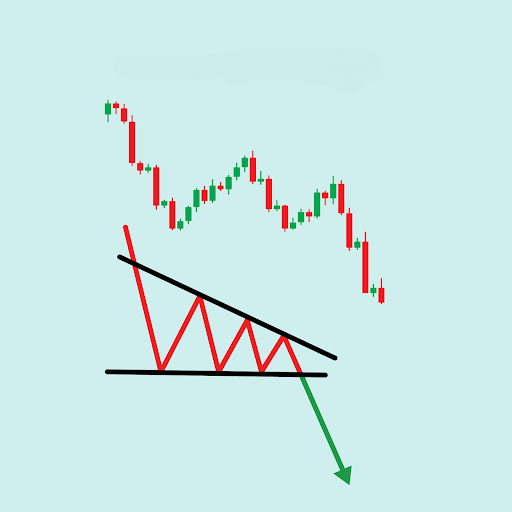 - Pattern Shape: The pattern is formed by a flat lower line connecting two or more lows at roughly the same price level, and a downward-sloping upper line connecting two or more descending highs.