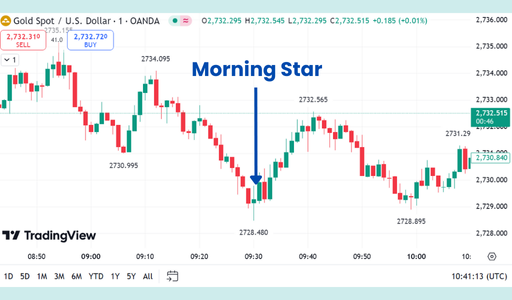 The Morning Star is a three-candle bullish reversal pattern that represents a "dawn" of new buying pressure after a dark period of selling. It visualizes the transition from bear control to a state of indecision, followed by a final, decisive bull victory.