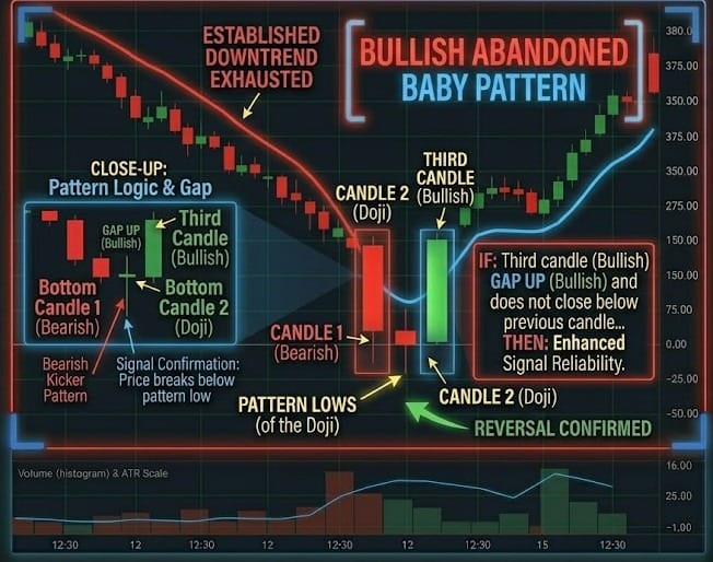 - IF: The first candle is a large bearish candle, followed by a Doji that gaps completely below the first candle’s low... * THEN: The "abandonment" has begun. This gap shows that the bears pushed price to an extreme where no one was willing to sell anymore, leaving the Doji "stranded" in no-man's-land.
