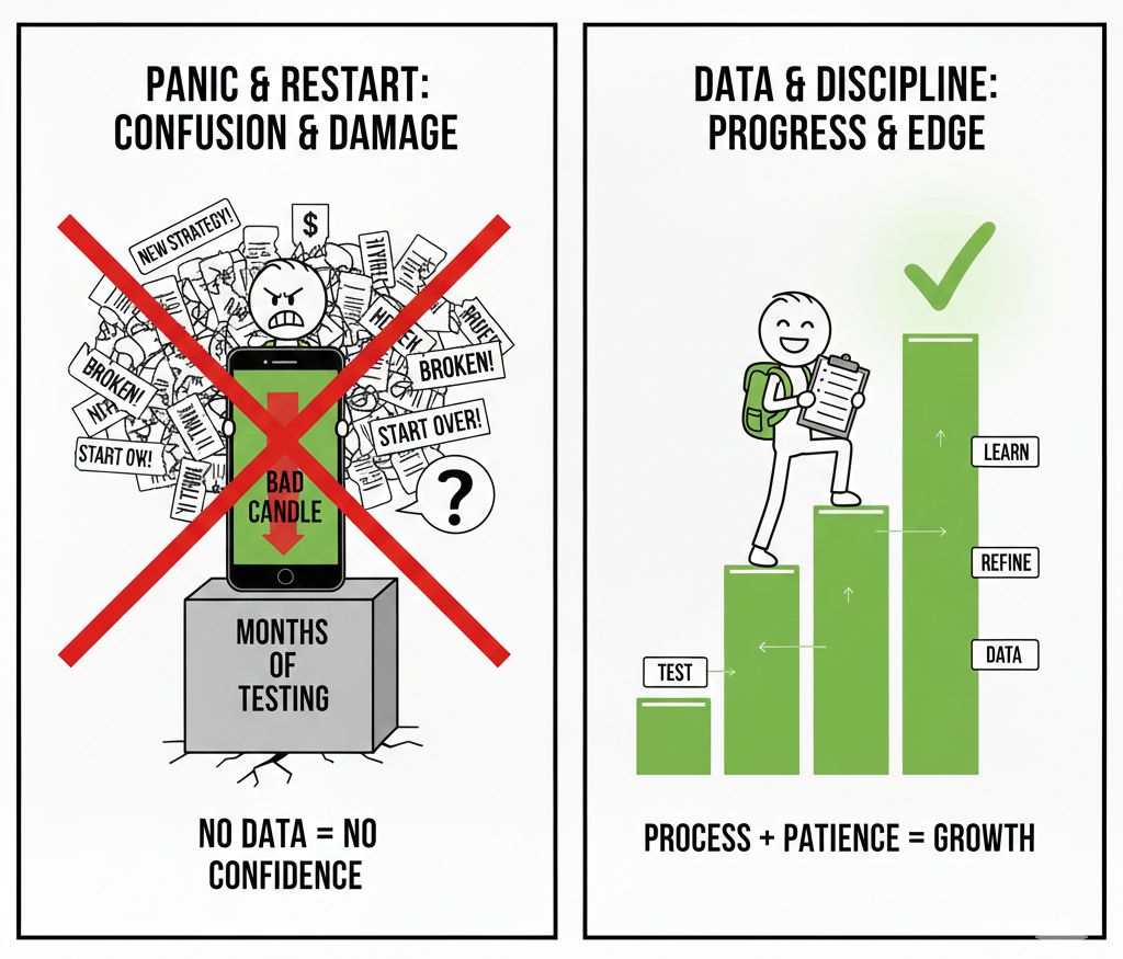 One losing trade does not mean your strategy is broken. One bad candle does not erase months of testing. Yet many traders panic after a small loss and jump to something new.