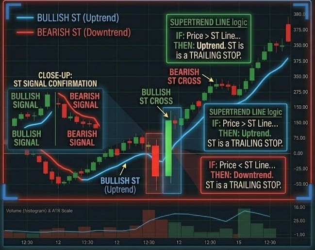 The SuperTrend is a trend-following indicator that combines price action with volatility. It is plotted on the price chart and uses the Average True Range (ATR) to calculate its distance from the current price. It acts as a dynamic support and resistance line that "flips" its position and color based on whether the bulls or bears are winning the volatility battle.