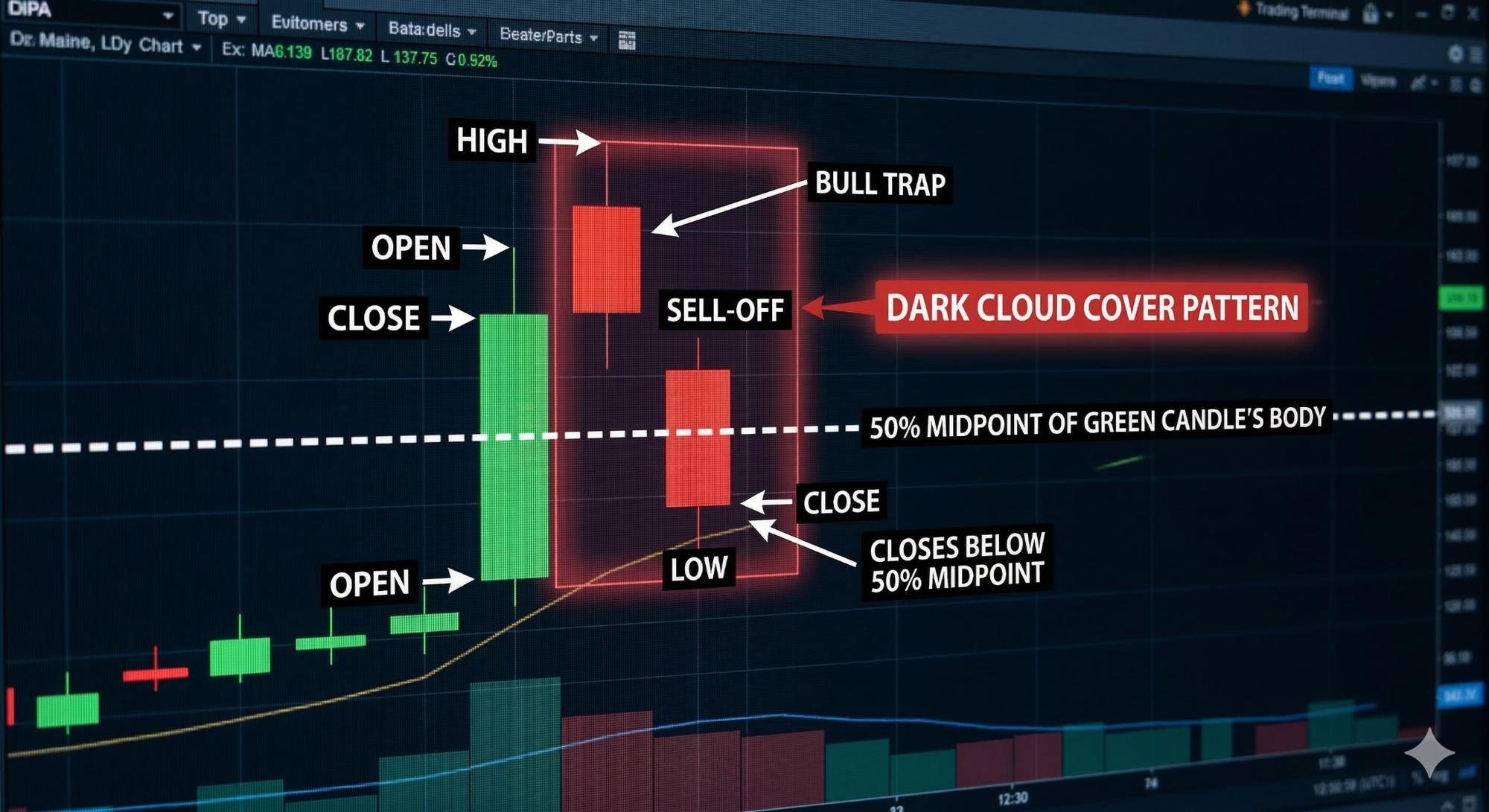 - THEN: The pattern is valid. This "dark cloud" piercing through the midpoint proves that sellers have successfully reclaimed more than half of the previous day's gains, signaling a major loss of bullish momentum.