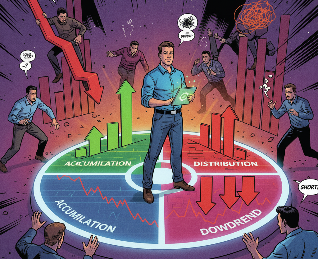 Every market runs through four phases: accumulation, uptrend, distribution, and downtrend. Each phase has a rhythm. When you know where you are, you stop reacting and start planning. You take trades that fit the cycle instead of fighting it.