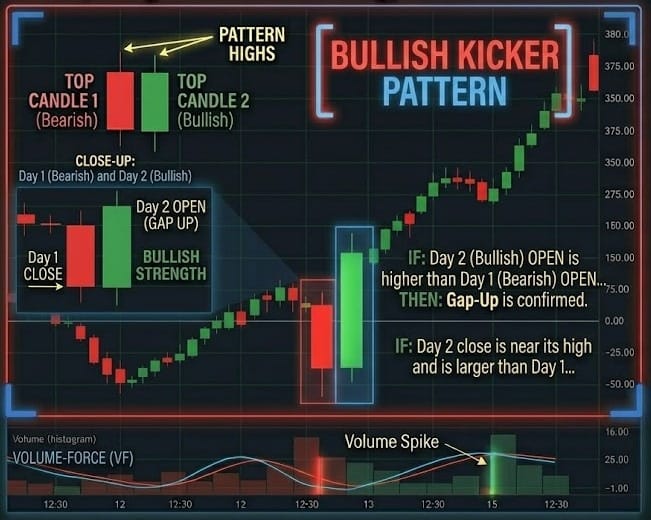The Bullish Kicker is arguably the most powerful reversal pattern in technical analysis. It is a two-candle pattern that occurs when a strong downtrend is suddenly interrupted by a massive gap up.