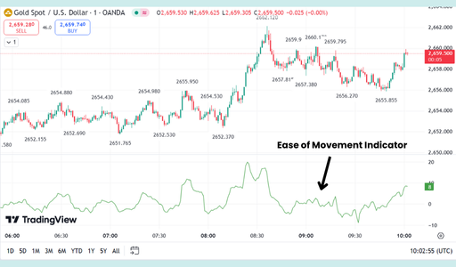 The Ease of Movement (EOM) is a momentum oscillator that looks at the relationship between price change and volume. It is designed to show how much "effort" is required to move the price. If price moves easily on low volume, the EOM will spike; if it takes massive volume to move the price only a small amount, the EOM stays near zero.