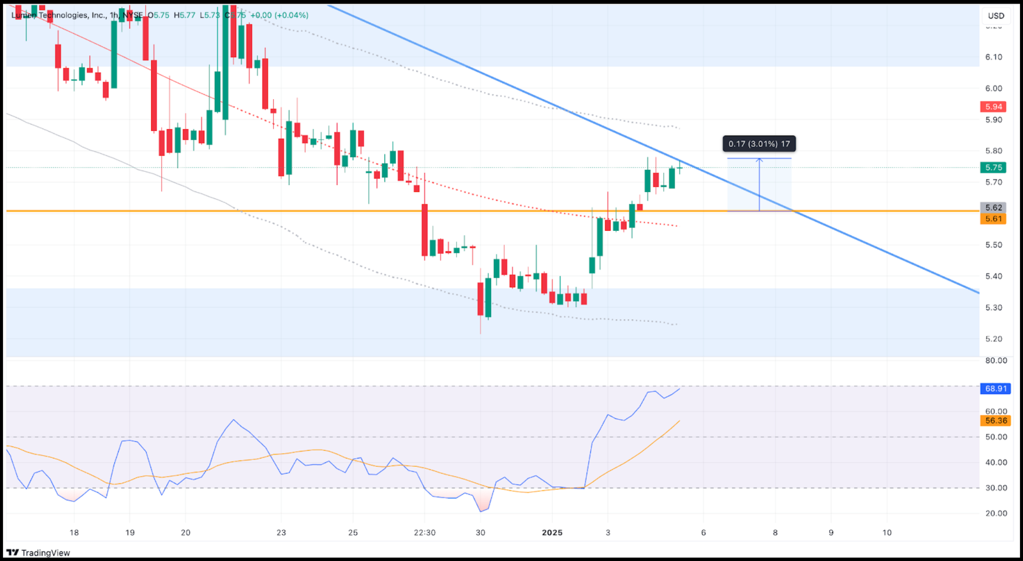 I initiated a buy position at $5.61. The stock performed exceptionally well right from market open, surging toward the trendline.