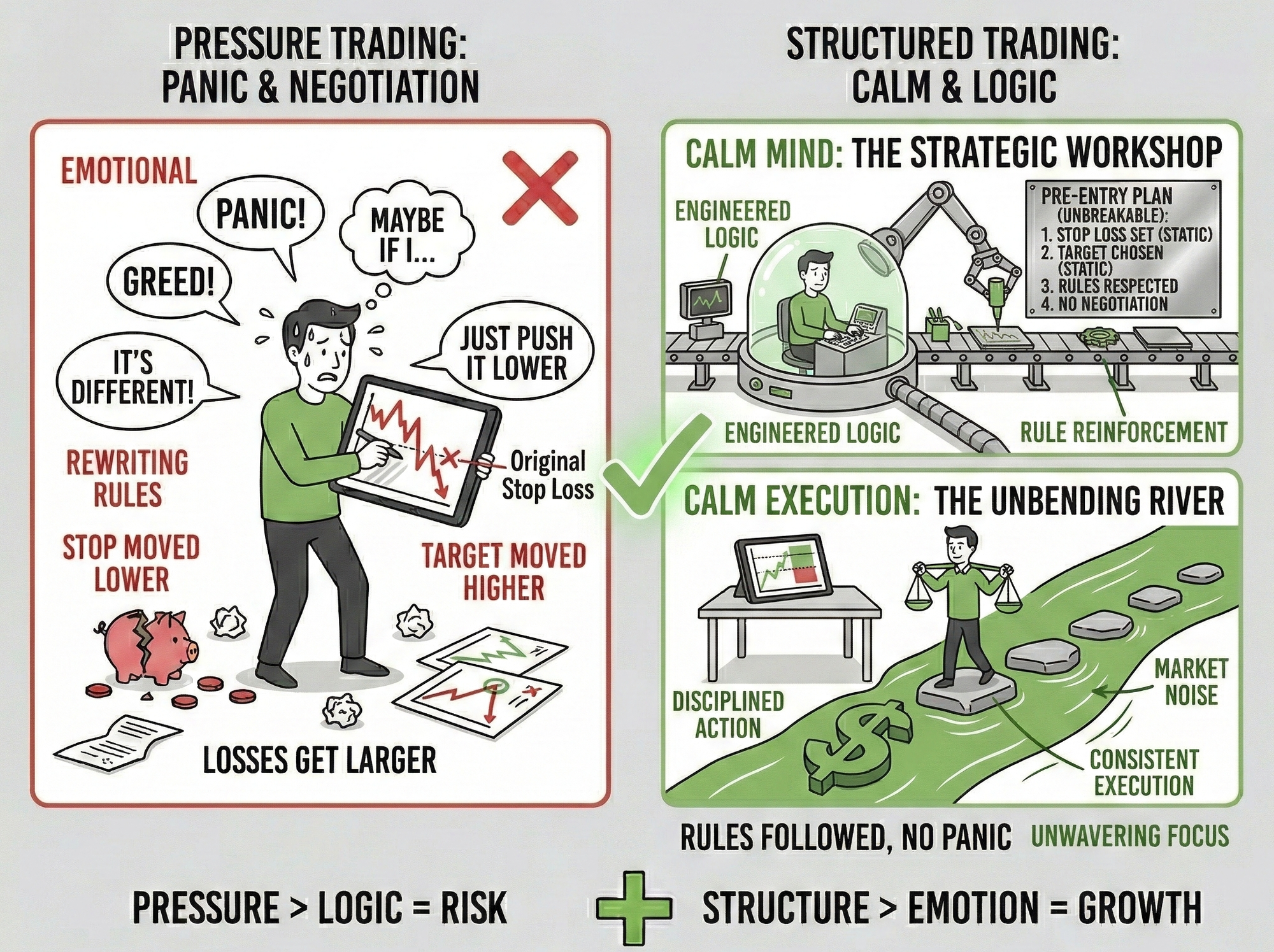 That’s when the rules get rewritten. The stop gets moved further away. The target gets pushed higher. A normal pullback suddenly feels dangerous. Decisions become emotional instead of structured.